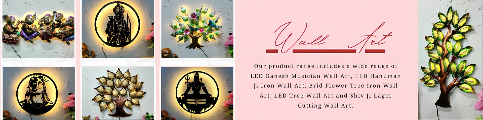 Our wall art collection brings together the power of storytelling and visual elegance. Crafted in metal and iron, pieces like the LED Ganesh Musician Wall Art, Lord Hanuman Ji Wall Hanging, Musician Lady with Tree Art, and Bird Flower Tree Decor are perfect for those seeking a divine, cultural, or nature-inspired presence on their walls. The Elephant Family Wall Art and Sunset Tree Design bring in warmth and serenity, while the LED Radha Krishna Frame adds spiritual grace with a contemporary glow. These artworks are ideal for living rooms, entryways, pooja corners, or gifting to those who appreciate meaningful decor.