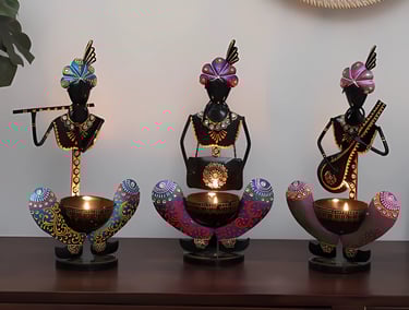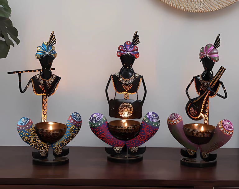 Ganesh, Krishna, Elephant, and Peacock-themed T-Light holders.
